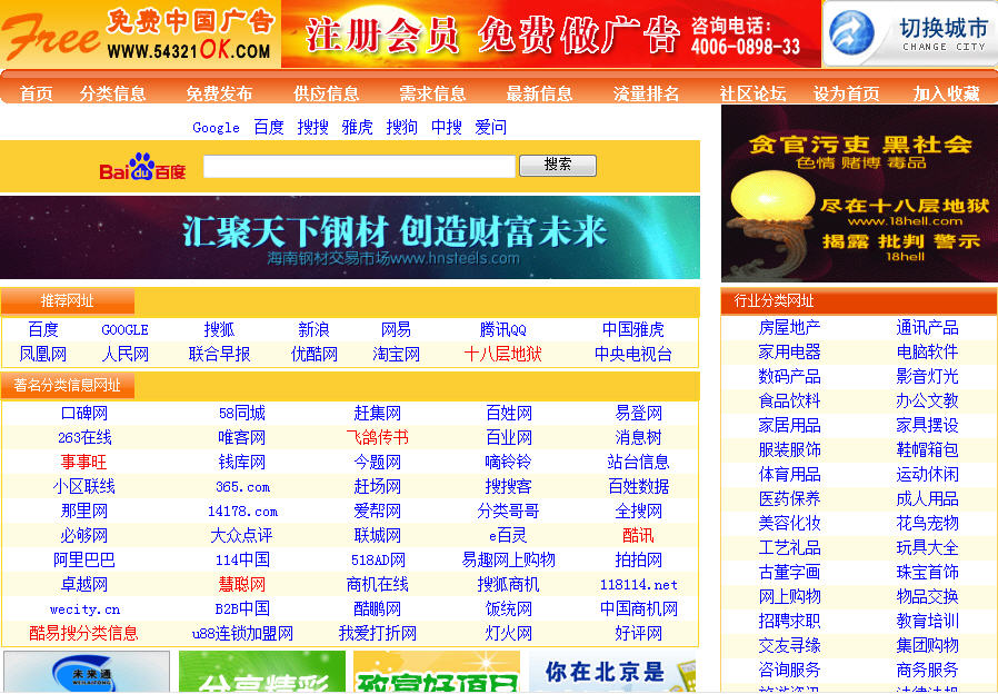 免費(fèi)中國(guó)廣告網(wǎng)站致力于網(wǎng)絡(luò)信息分類模式的探索,開發(fā),建立,創(chuàng)新,是融分類信息導(dǎo)航和分類信息為一體的大型綜合門戶網(wǎng)站,旨在為訪問者提供簡(jiǎn)潔,精準(zhǔn),及時(shí)的分類信息導(dǎo)航服務(wù)和免費(fèi)方便的分類信息發(fā)布平臺(tái), 聯(lián)合業(yè)界同仁共同開發(fā)網(wǎng)絡(luò)資源...