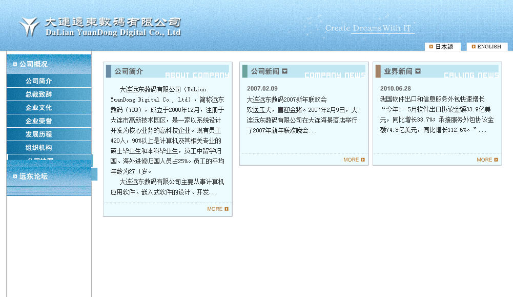 大連遠(yuǎn)東數(shù)碼有限公司(DaLian YuanDong Digital Co., Ltd),簡(jiǎn)稱遠(yuǎn)東數(shù)碼(YDD),成立于2000年12月,注冊(cè)于大連市高新技術(shù)園區(qū),是一家以系統(tǒng)設(shè)計(jì)開發(fā)為核心業(yè)務(wù)的高科技企業(yè)?,F(xiàn)有員工382人,90%以上是計(jì)算機(jī)及其相關(guān)專業(yè)的碩士畢業(yè)生和本科畢業(yè)生,員工中留學(xué)歸國(guó)、海外進(jìn)修歸國(guó)人員占21%。員工的平均年齡為25.8歲.
